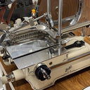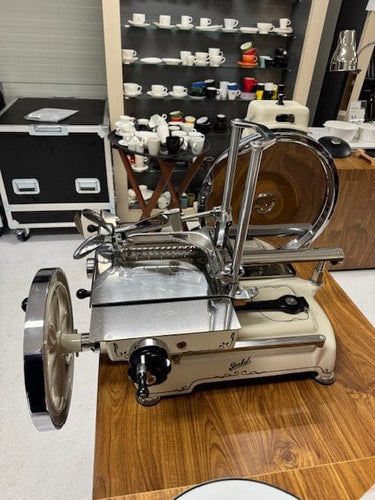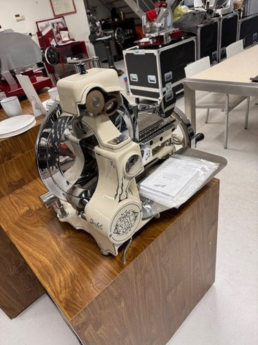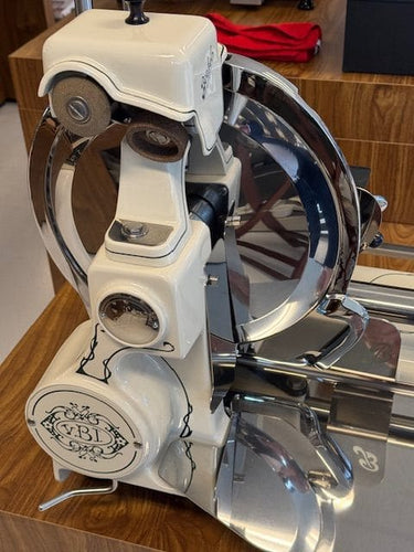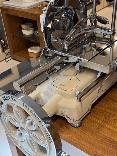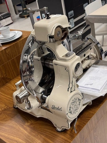 PERFORMANCE • Specially cast aluminum alloy and stainless steel and rubber feet for total stability while cutting • Adjustable legs in different configurations 319mm 100cr6 chromed steel blade with professional profile: reduces waste and ensures perfect slices • Fast forward and reverse feed system for food trays combined with a manual millimetric knob for perfect product positioning • Classic Berkel design of the tower, a combination of elegance and robust design • Gold-colored decorations to enhance painted parts • Classic Berkel square profile flywheel internally balanced to prevent unintended rotation in any position • Removable sharpener included with a single-motion control system to increase sharpening reliability • Measuring plate opening knob with 11 positions to adjust the adhesive thickness from 0 mm to 1.5 mm • Very thin residual product to minimize material waste • Wide steel deflector with easy coupling for better slice removal NFC TAG cast into the machine housing as a certificate of authenticity CLEANING & HYGINE • Stainless steel professional food plate with a removable system for easy machine cleaning • Supported stainless steel product press holder for complete product locking • Wide space for quick and easy cleaning and a rear space to collect waste material • Quick removal system of the slice deflector for easy cleaning of the machine • Stainless steel removable drip tray, dishwasher safe SAFETY- Stainless Steel Full Blade Ring Guard