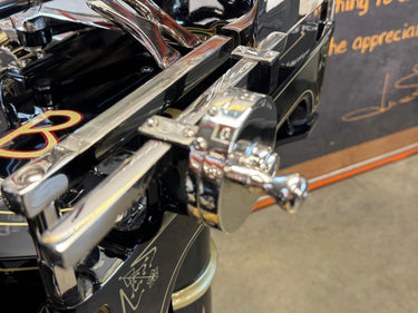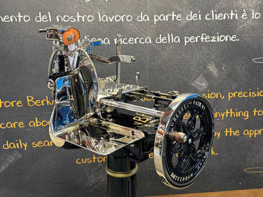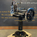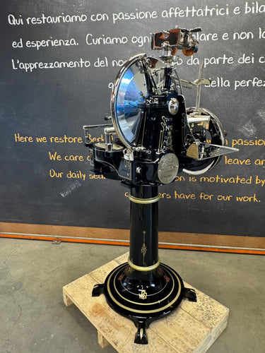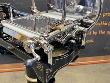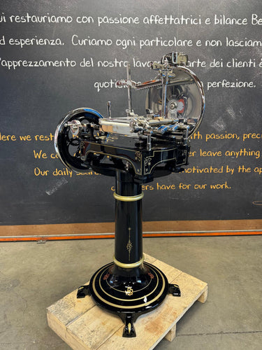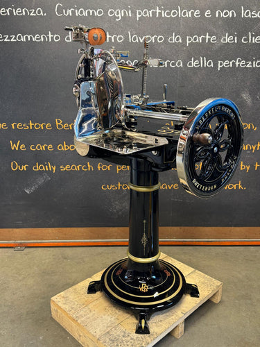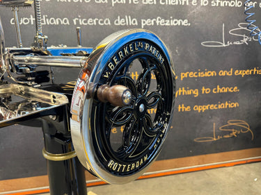 Het hart van de machine is het 319 mm dikke verchroomd stalen mes (100Cr6) met een professioneel profiel, dat afval reduceert en zorgt voor perfecte plakjes. Het geavanceerde snel-opruim- en terugzetsysteem van de voedselplaat, in combinatie met een handmatige millimeterknop, zorgt voor een perfecte positionering van het product. Het klassieke Berkel-torenontwerp combineert elegantie met een robuust design, versterkt door gouden versieringen op de geverfde onderdelen.
